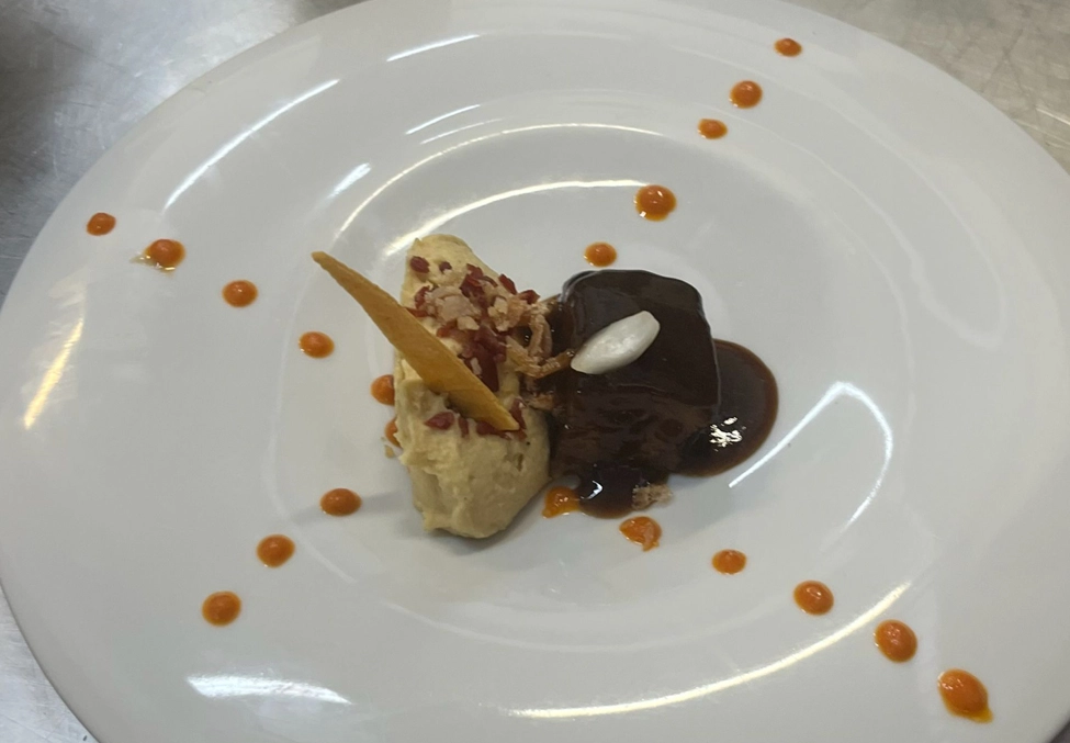 Panceta glaseada con humus de garbanzo y gel de pimiento de la vera